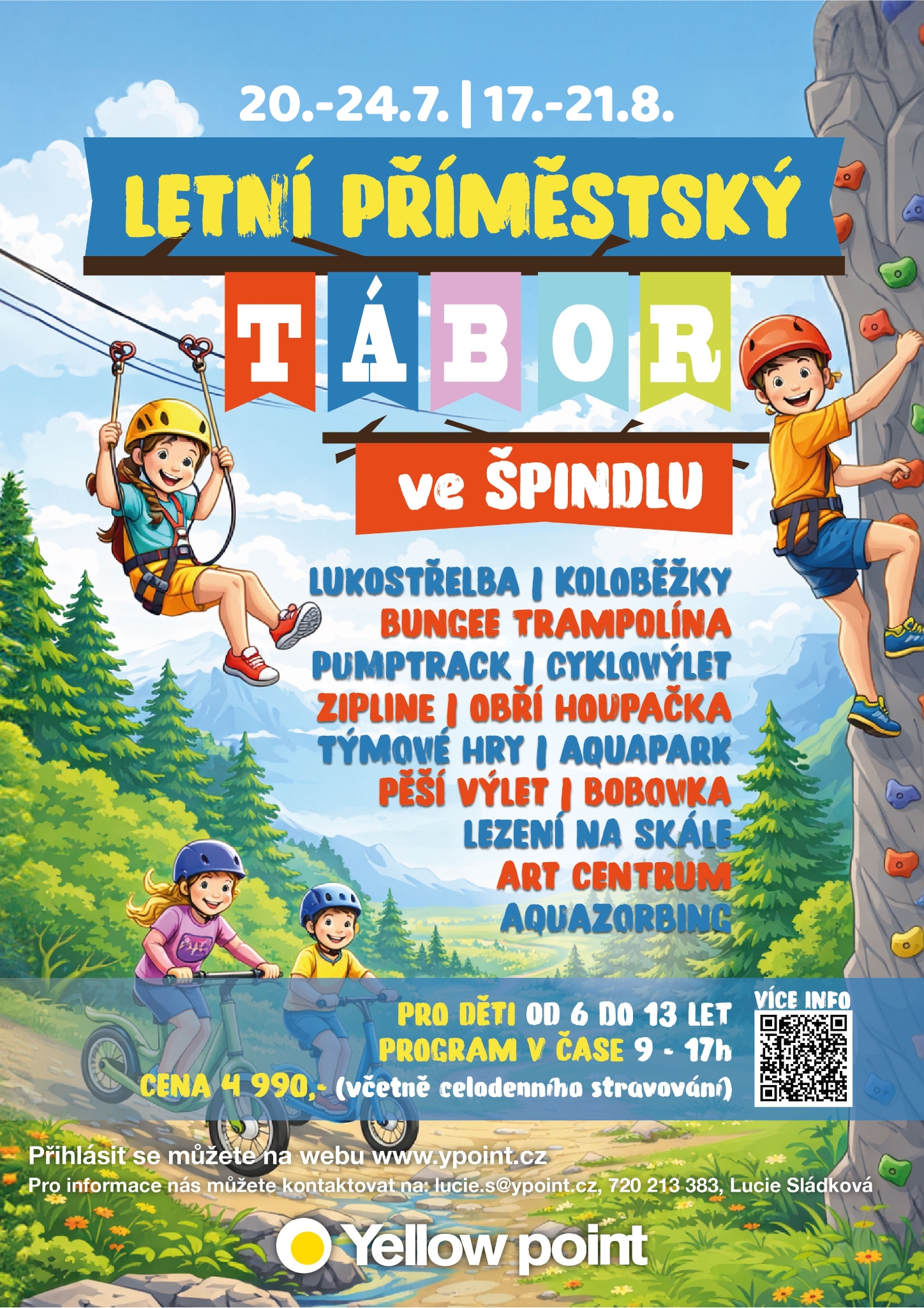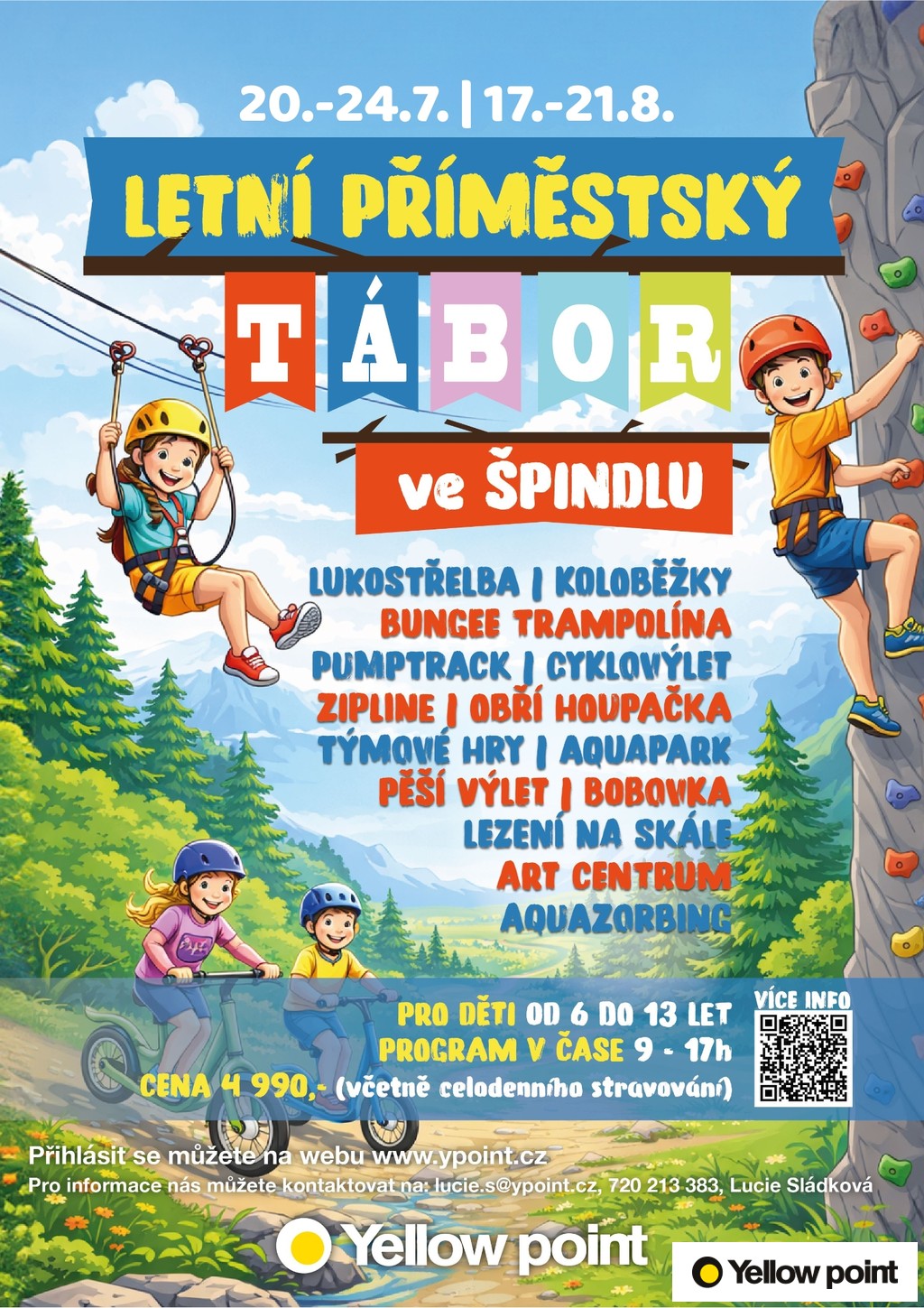 Vylezeme na skály, sjedeme si z vršku Krkonoš na koloběžce, vyrazíme na výlet do hor, zhoupneme se na obří houpačce, osvojíme si základy jízdy na pumptracku, vyzkoušíme si udělat krok do prázdna na zip line přes přehradu Labská, zařádíme si v aquaparku, užijeme si cyklovýlet nebo také bobovou dráhu. Samozřejmostí je náš Adventure park, kde si vyzkoušíme vše, co nabízí. Připravené jsou pro vás i kreativní a soutěžní výzvy a mnoho dalšího!