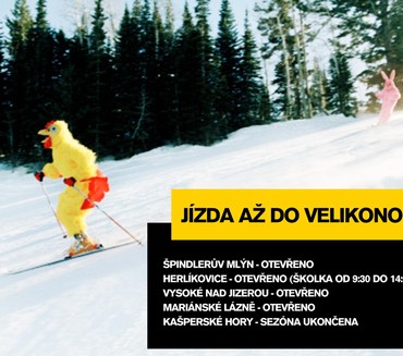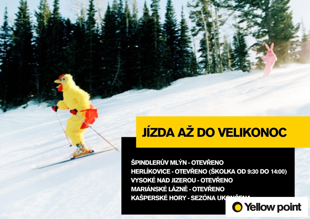 Yellow Point bude mít v areálech Špindlerův Mlýn, Herlíkovice, Vysoké nad Jizerou (včetně Jablonce a Kamence) a Mariánské Lázně otevřeno až do Velikonoc. V Kašperských Horách jsme sezónu již ukončili v návaznosti na sněhové podmínky a počasí obecně.