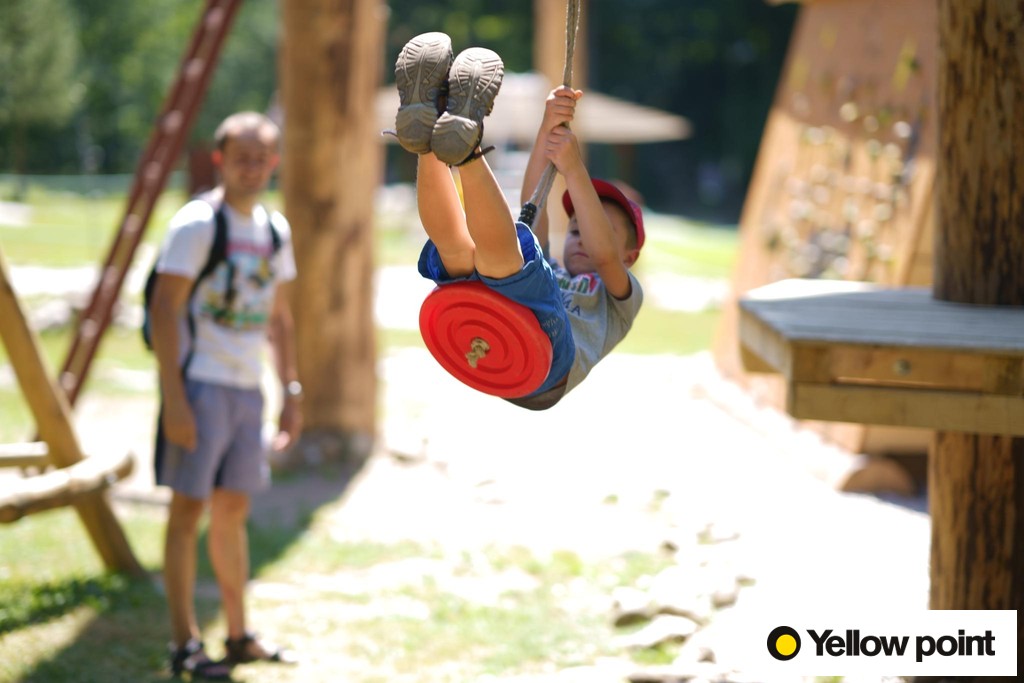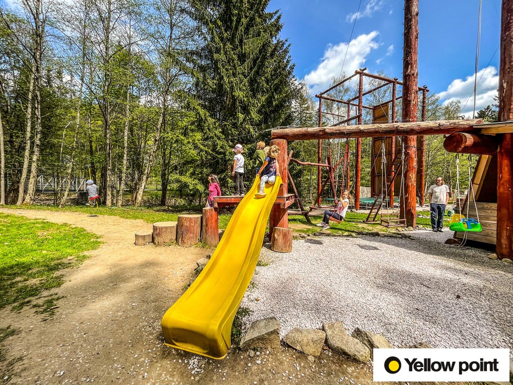 Dětské hřiště v Adventure parku je zdarma a nabízí mini zip line, skluzavku i prolézačky.